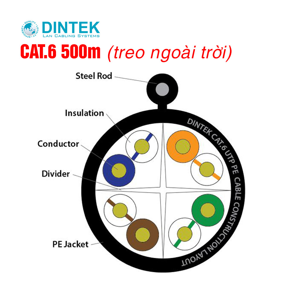 Dintek CAT.6 500m treo ngoài trời là cáp mạng được ưa chuộng và sử dụng phổ biến trên các công trình ở Việt Nam. Cáp Dintek cho khả năng truyền tải ổn định, cho cả trường hợp truyền tải dữ liệu với khoảng cách xa, ít bị hư hại do tác động của môi trường. Cáp mạng treo ngoài trời CAT.6 500m, thép gia cường dùng treo móc.