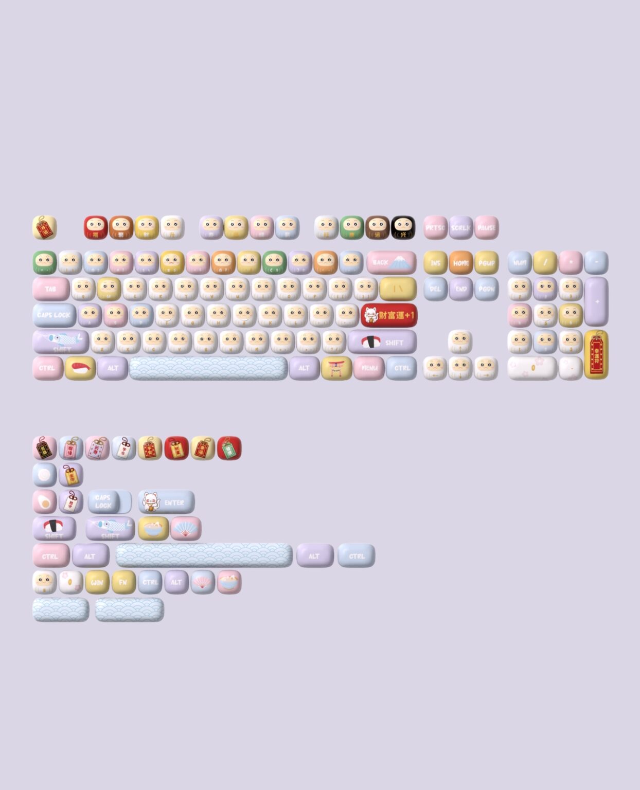 • Chủ đề biểu tượng may mắn: Bộ keycap mang đến hình ảnh của các biểu tượng mang lại may mắn như cỏ bốn lá, đồng xu vàng, mèo thần tài và nhiều họa tiết khác.