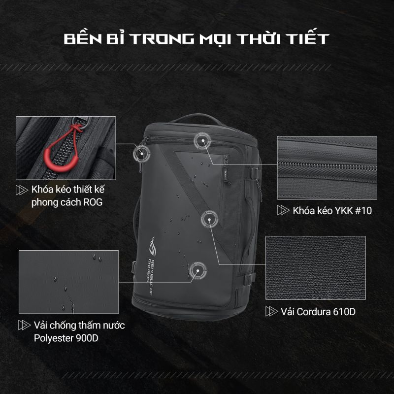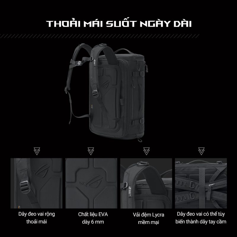 ROG Archer Weekender BP2703 nổi bật với thiết kế 2 in 1, cho phép bạn sử dụng như một ba lô truyền thống hoặc một túi xách khi cần. Thiết kế này mang đến sự linh hoạt tối ưu cho người dùng, giúp bạn dễ dàng thích ứng với từng tình huống sử dụng khác nhau, từ công việc văn phòng đến các chuyến đi chơi xa.