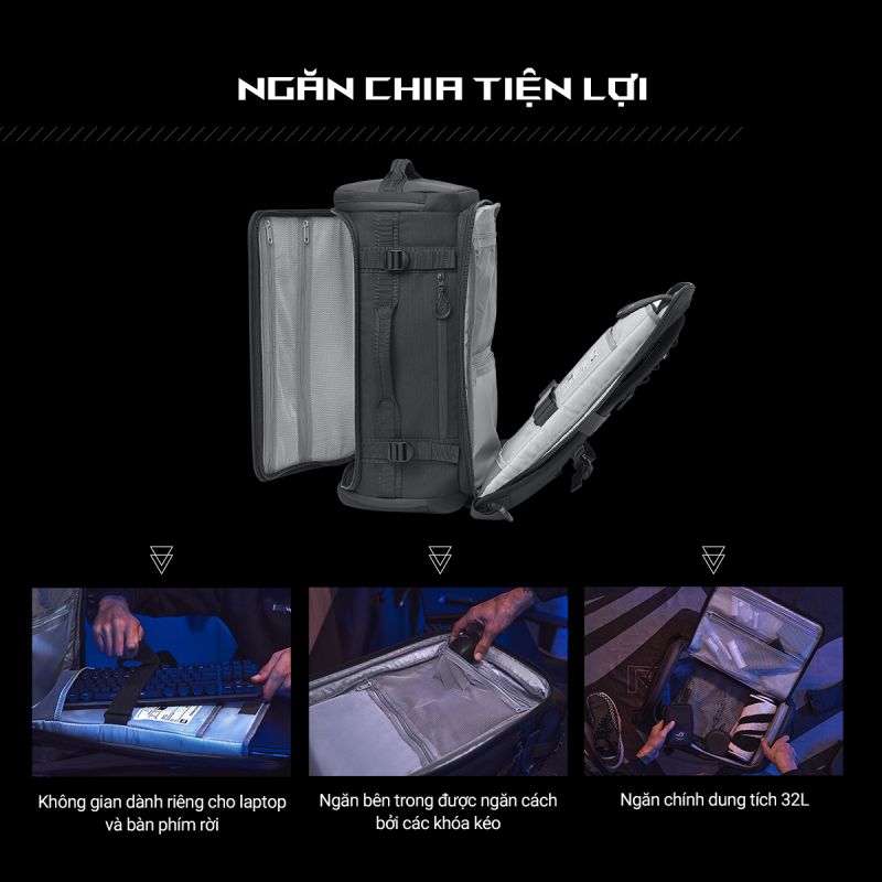 BP2703 ROG Archer Weekender được trang bị nhiều ngăn chứa thông minh, giúp bạn dễ dàng tổ chức và sắp xếp các phụ kiện như tai nghe, sạc, chuột, và các vật dụng cá nhân. Tất cả các ngăn đều được bố trí hợp lý để bạn có thể dễ dàng truy cập vào từng món đồ khi cần.