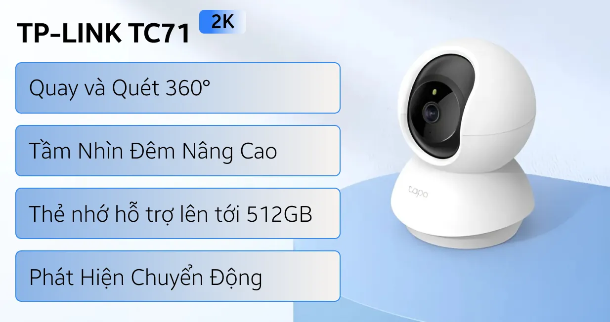 Camera Wifi quay quét 3MP TP-Link Tapo TC71 là lựa chọn hoàn hảo cho những ai muốn sở hữu một thiết bị giám sát an ninh chất lượng cao, dễ dàng cài đặt và sử dụng. Với nhiều tính năng thông minh như quay quét toàn diện, phát hiện chuyển động, âm thanh hai chiều và khả năng quan sát ban đêm, Tapo TC71 mang lại sự yên tâm cho người dùng, đảm bảo an ninh cho ngôi nhà và nơi làm việc.