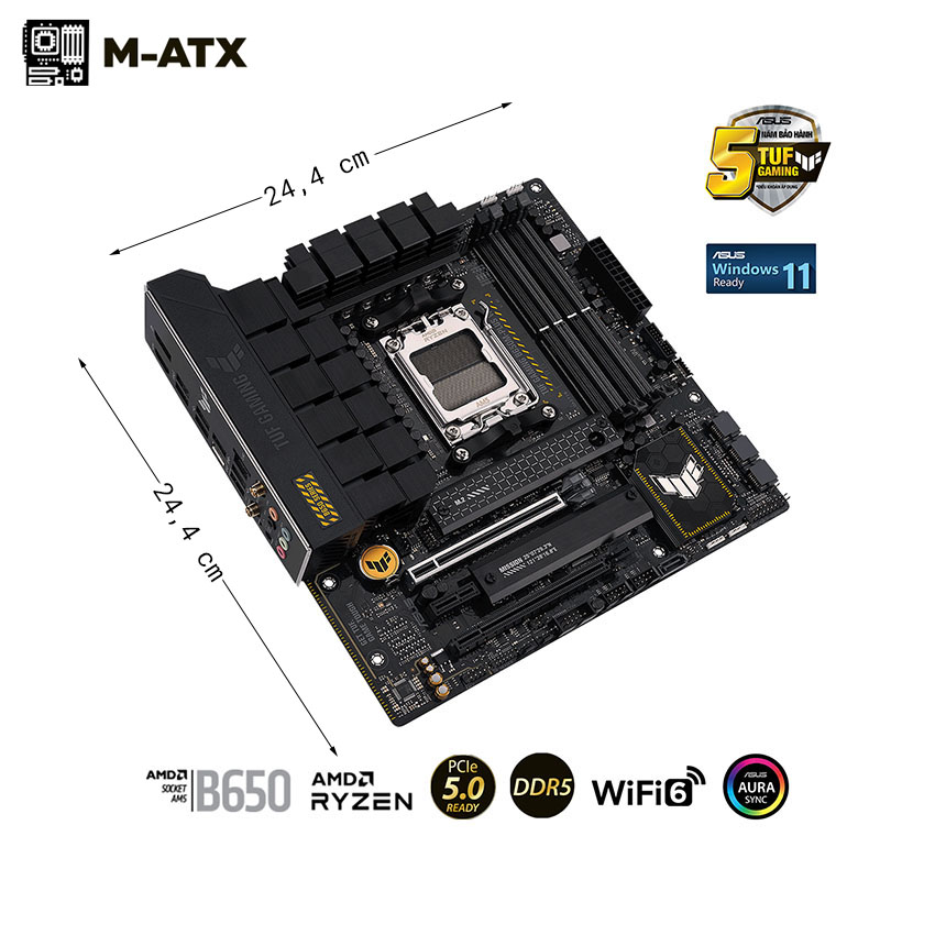 ASUS TUF GAMING B650M-PLUS WIFI là một bo mạch chủ Micro-ATX chất lượng cao thuộc dòng TUF Gaming của ASUS, được thiết kế đặc biệt để mang lại hiệu suất ổn định và bền bỉ cho người dùng. Với chipset AMD B650 và socket AM5, bo mạch chủ này hỗ trợ các bộ vi xử lý AMD Ryzen™ thế hệ 7000, cung cấp hiệu suất mạnh mẽ cho chơi game, sáng tạo nội dung và làm việc chuyên sâu. Thiết kế chắc chắn và các tính năng tiên tiến giúp ASUS TUF GAMING B650M-PLUS WIFI là một lựa chọn lý tưởng cho những người yêu thích một hệ thống chơi game hoặc làm việc có độ bền cao.