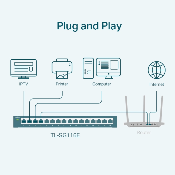 5. Dễ Dàng Sử Dụng: Với tính năng Plug-and-Play, TL-SG116E không yêu cầu cài đặt phức tạp, giúp người dùng nhanh chóng mở rộng hệ thống mạng mà không cần nhiều kiến thức kỹ thuật.